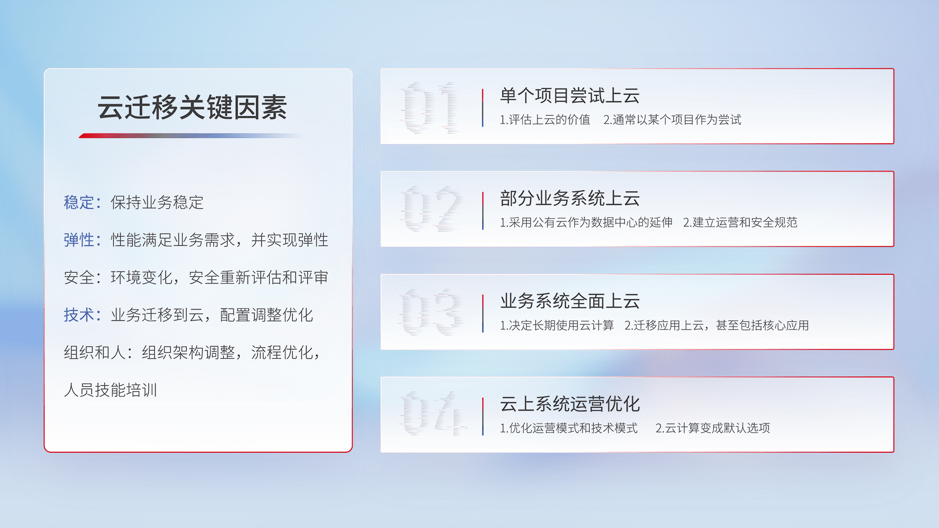 结合实际业务,,,从规划设计、、、云平台选型、、、云原生改造、、、数据迁移、、、、集成交付,,,,迁移全过程为客户识别最佳上云路径,,做好风险识别管理,,设计网络架构、、、、身份权限、、、安全审计合规、、、、操作审计、、、日志审计、、、监控告警策略、、、、多站点容灾设计等,,,对云上基础设施进行整体规划,,,提升IT治理水平,,,,以满足弹性、、高可用、、、、高性能的需求。。。。