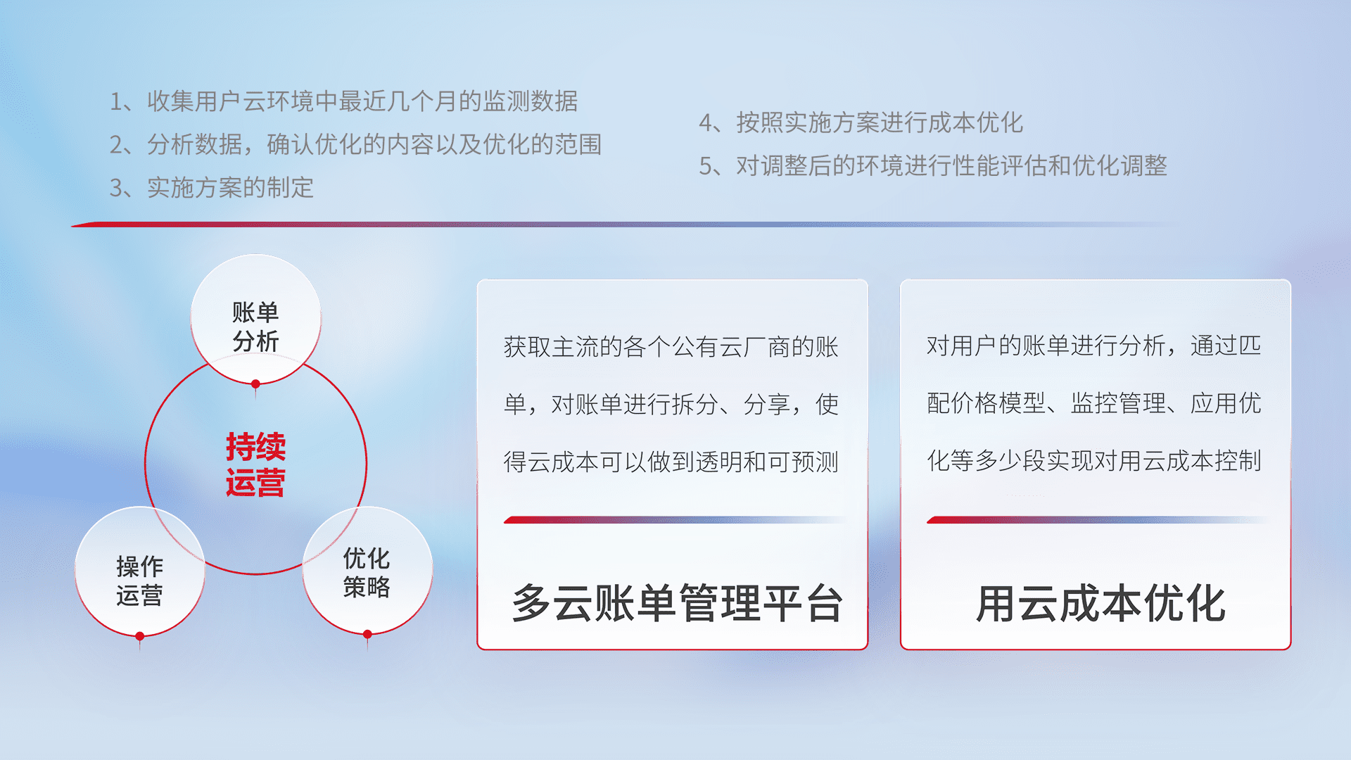 通过多云纳管,,以统一的资源数据模型把客户的云资源进行抽象和封装,,进而实现对多云资源的统一操作,,,保障云资源管理的可靠性、、、稳定性与可用性。。。。量身定制化运维内容,,配置、、开发运维、、、补丁管理、、、、备份、、、、监控、、、、认证和访问管理、、、、审计和日常巡检等,,保障在用云过程中的可靠度,,,稳定度以及高可用率。。。